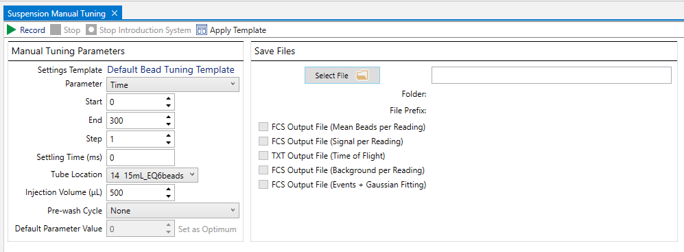 5 Click Record to start Manual Tune. The introduction system starts automatically and Data Display is opened. The plots update while waiting for beads to reach the detector.